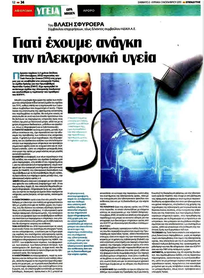 Σφυροέρας, Β. 2013. Γιατί έχουμε ανάγκη την ηλεκτρονική υγεία. Στην Εφημερίδα ΕΠΕΝΔΥΤΗΣ, σ. 34 (2.11.2013). Βλ. κι εδώ: http://www.sfee.gr/files/page/4-11-13%20-%20DAILY%20PRESS%20UPDATE_1.pdf